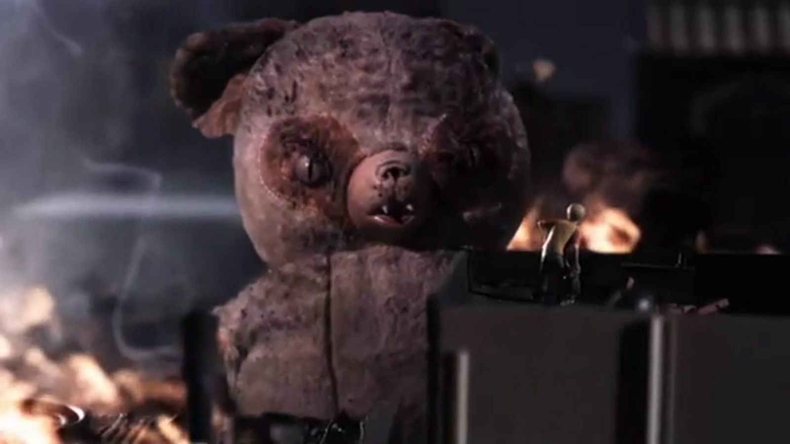 An image taken of the teddy bears coming alive and destroying every aspect of the city symbolising the destruction of the country thanks to the government and possibly showing how something typically very playful and child like has turned viciously evil due to the government or indeed any political power.